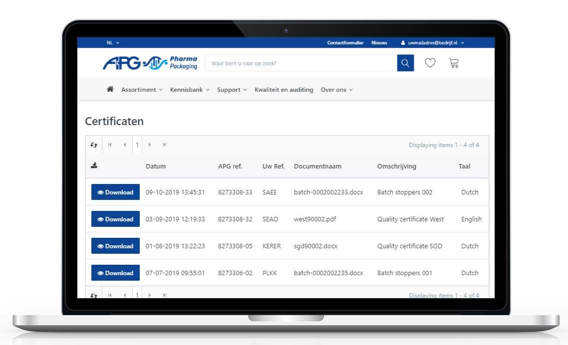 Bij het aanvragen van prijzen voor specifieke artikelen, aantallen en plaats van levering ontvangt u van APG Europe een gedetailleerde offerte. Alle offertes die aan u en uw organisatie zijn uitgebracht vindt u terug onder 'Offertes' binnen de module Transacties.